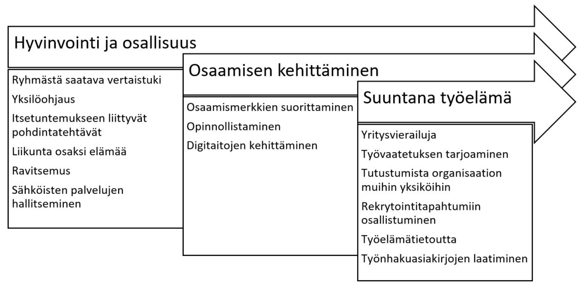 Palvelussa osallistujat saavat vahvaa ohjausta ja tukea niin ryhmänä kuin yksilönä. Asiakaslähtöisyys ilmenee siten, että palveluun tulija valitsee alustavasti itselleen kolmesta polusta sopivimman: hyvinvointi ja osallisuus, osaamisen kehittäminen vai työelämään suuntaaminen.