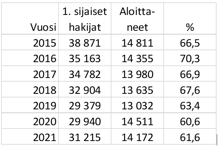 Vuoden 2021 kevään yhteishaussa valituista ja opiskelupaikan vastaanottaneista ylioppilaiden osuus oli 61,6%. Taulukosta 2 voidaan havaita viimeisen kahden vuoden aikana tapahtunut suhteellinen muutos opintonsa aloittaneiden ylioppilaiden määrässä. Muutokseen on todennäköisesti vaikuttanut eniten todistusvalinnan mahdollistaminen myös ammatillisen toisen asteen todistuksilla.