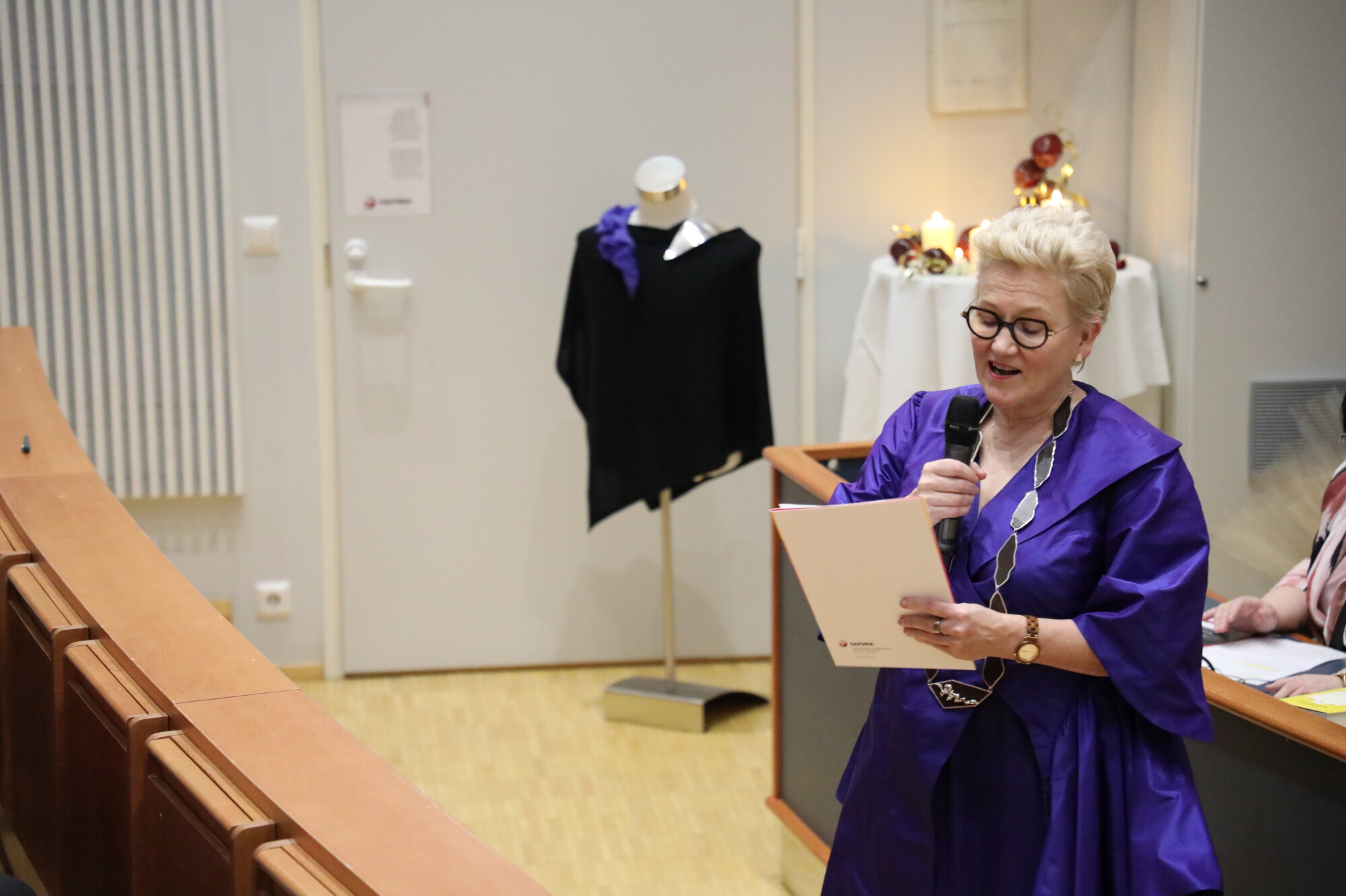 A concrete example of this was shown at the graduation ceremony, where Rector Mervi Vidgrén wore an outfit designed and made by design student Emma Timoharju for the President’s Independence Day evening reception, as well as a cape made for the Rector of Savonia just before the ceremony (Essi Koponen’s thesis). The jewelry seen at the Independence Day Reception was also on display (Anniina Saanila’s thesis).