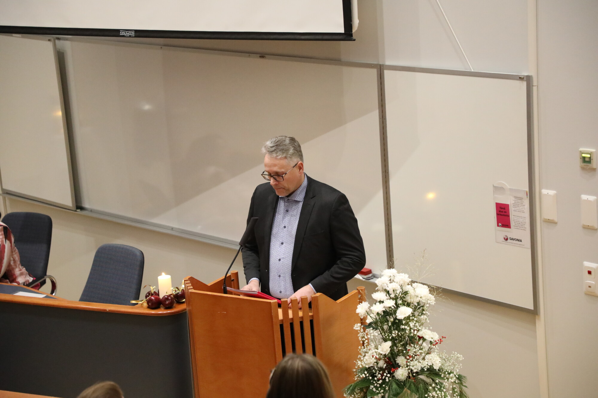 The keynote speech was delivered by Jukka Ryhänen, Chair of the Iisalmi City Council and a member of the city executive board, who is also a graduate of Savonia’s Degree Programme in Business Administration. He shared that his own studies took as long as 11.5 years due to starting a family and working alongside his studies. He emphasized the importance of the Iisalmi campus as a vibrant regional campus — the second largest of its kind in Finland.