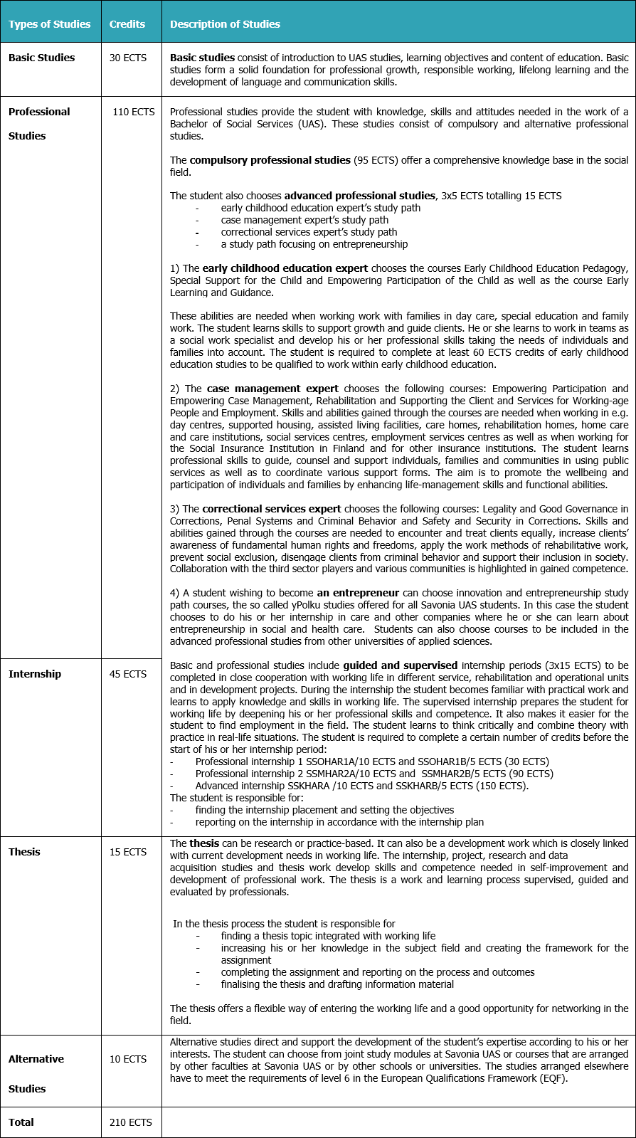 The extent of the Degree Programme in Social Services (UAS) is 210 ECTS. According to the curriculum, the student is expected to complete 60 ECTS during each study year; this means 1600 hours of student work. The student’s work comprises e.g. activating contact lessons, independent and online studies and internship. The internship is done in close cooperation with different working-life organisations providing early childhood education and social services. The internship can also be completed abroad. The studies include practice-based RDI activities.