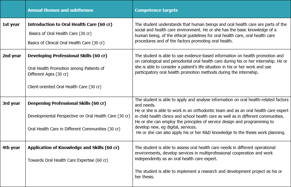The Bachelor of Health Care, Dental Hygienist, curriculum has been planned so that the - the degree programme provides the student with the knowledge, skills and competence required in the working life - the studies ensure the development of the student’s professional expertise. The student - drafts a personal study and career plan (PSP) including the recognition of prior learning (RPL) - is responsible for the progress of his or her studies