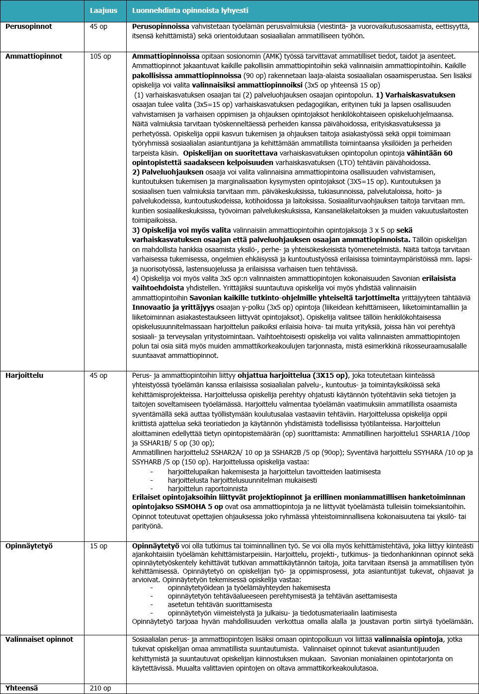 Ensimmäisenä opiskeluvuonna opiskelija hankkii perusosaamisen sosiaali- ja terveysalan toimintaympäristöstä, asiakkuudesta ja omasta oppijuudestaan. Opiskelija omaksuu reflektiivisen, tutkivan ja kehittävän työotteen sekä sosiaali- ja terveysalan ammattieettiset periaatteet. Toisena vuonna opiskelija perehtyy varhaiskasvatuksen ja sosiaaliohjauksen ohjaustehtävään, sosiaalialan moninaiseen asiakastyöhön ja palveluihin. Kolmantena ja neljäntenä vuonna opiskelija syventää ammatillista osaamistaan varhaiskasvatuksen, palveluohjauksen, yrittäjyyden tai moniammatillisen yhteisötyön osaajana sekä hankkii, soveltaa ja syventää tutkimuksellista kehittämisosaamistaan, osallistavaa yhteiskuntaosaamistaan sekä johtamisosaamistaan.