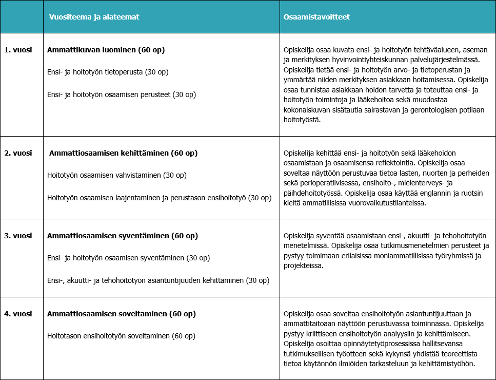 Ensihoitajaopiskelijan asiantuntijuuden kehittyminen lähtee hoitotyöhön ja ensihoitotyöhön perehtymisestä ja etenee kehittämisen ja syventämisen kautta ensi- ja hoitotyön soveltajaksi. Sairaalan ulkopuolisen ensihoitotyön opinnoissa edetään perustasoisen ensihoitotyön opintojen kautta hoitotasoisen ensihoitotyön osaamiseen. Vuositeemat ja niiden osaamistason kuvaukset sekä lukukausiteemat ja teemojen osaamistavoitteet auttavat oppijaa suunnittelemaan ja arvioimaan ammatillista kasvuaan ja keskittymään ydintietojen ja -taitojen sekä eettisten periaatteiden oppimiseen. Oppiminen on tavoitteellista, tilannesidonnaista ja vuorovaikutuksellista toimintaa. Tämä edellyttää oppijan omien tavoitteiden ja päämäärien tunnistamista. Tutkinnon suorittamisen ja riittävän työkokemuksen jälkeen on mahdollista hakeutua suorittamaan ylempää ammattikorkeakoulututkintoa.