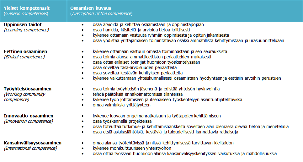 Bioanalyytikon osaamisprofiili rakentuu yleisistä ja ammatillisista kompetensseista.