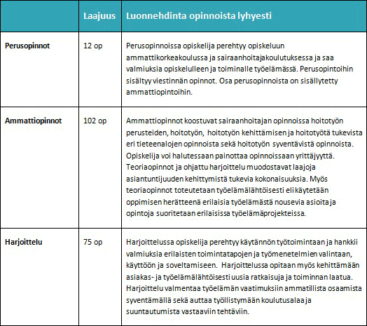 Sairaanhoitajan opinnot ovat 210 opintopistettä. Opetussuunnitelman mukaan yksi opiskeluvuosi tuottaa 60 opintopistettä, mikä vastaa 1600 tuntia opiskelijan työtä. Opiskelijan työ koostuu mm. lähitunneista, etä- ja itsenäisestä opiskelusta, verkko-opiskelusta ja harjoittelusta. Lisäksi opiskeluun sisältyy työelämälähtöinen tutkimus- ja kehittämistoiminta.