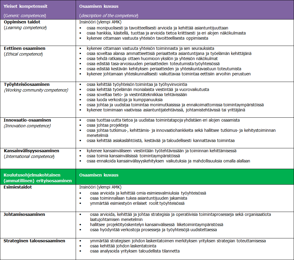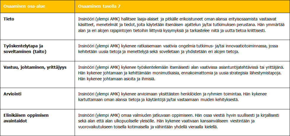 Insinöörin (ylempi AMK) koulutus on eurooppalaista ja suomalaista tasoa 7 (kansallinen viitekehys).