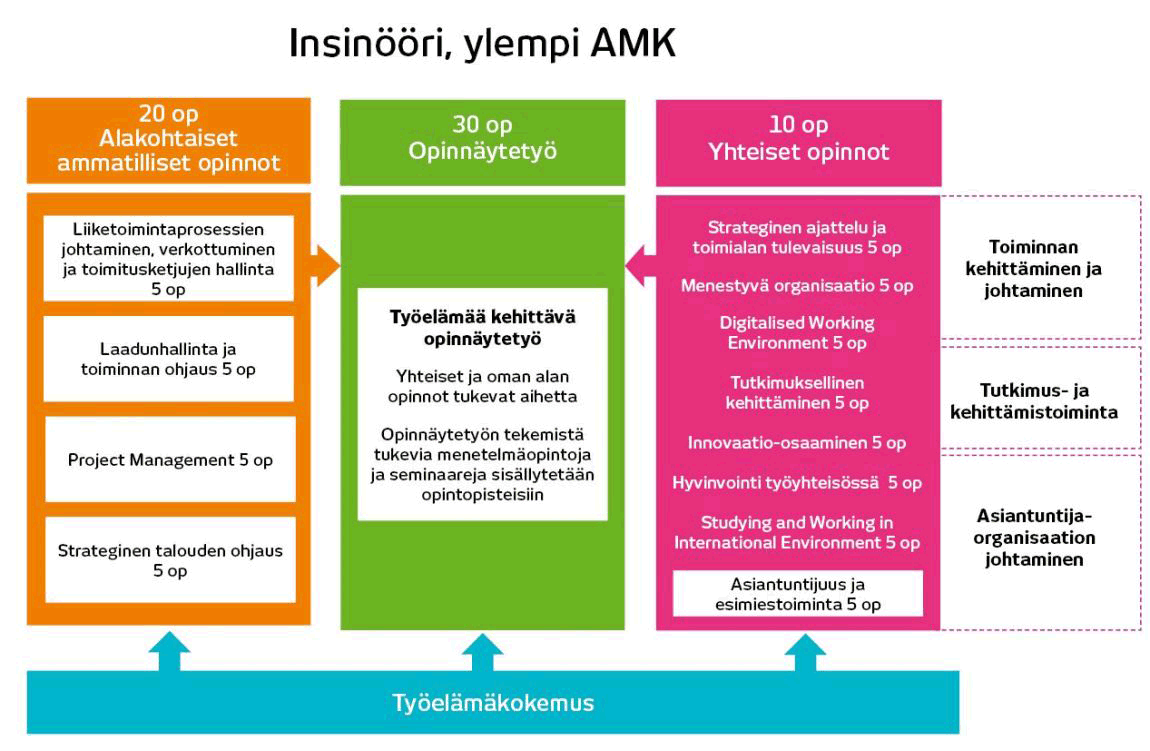 Insinööri (ylempi AMK) -opinnot ovat 60 opintopistettä. Täyspäiväisesti opiskelevalla opetussuunnitelman mukaan yksi opiskeluvuosi tuottaa 60 opintopistettä, mikä vastaa 1600 tuntia opiskelijan työtä. YAMK-opintojen opiskeluaika vaihtelee erilaisten koulutus- ja työtaustojen sekä yksiköllisen opiskeluaikataulun vuoksi. Ylemmän ammattikorkeakoulututkinnon 60 op:n laajuinen koulutus kestää 1,5 - 2 vuotta. Aikaisemmin hankittu osaaminen ja sen hyväksi lukeminen voi vaikuttaa opiskeluaikaa lyhentävästi.