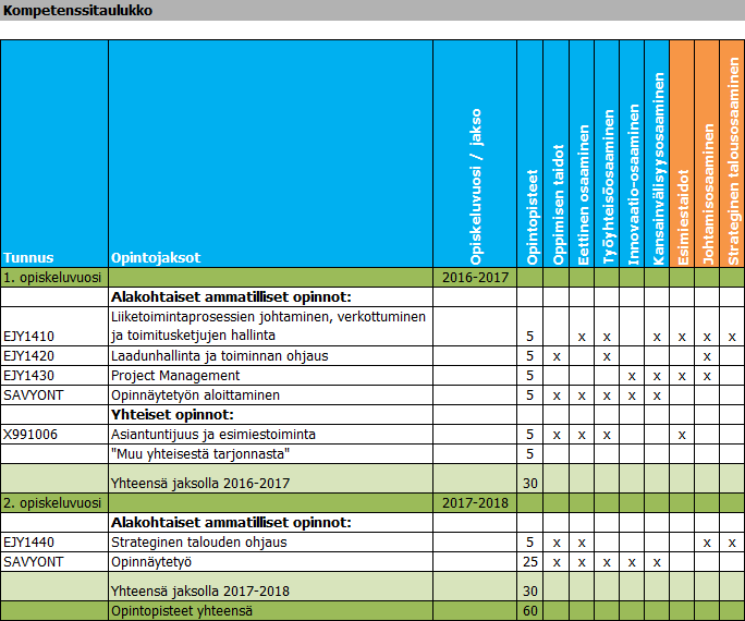 Insinöörin (ylempi AMK) osaamisprofiili rakentuu opintojaksojen tuottamasta osaamisesta. Alla olevasta kompetenssitaulukosta näkyy eri vuosien opintojaksot ja mitä osaamisen osa-alueita ne kehittävät.