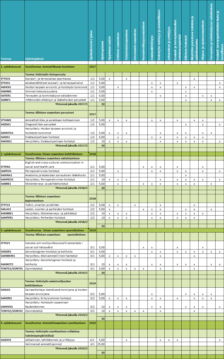 Sairaanhoitajan asiantuntijuus rakentuu opiskeluvuosien ja opintojaksojen tuottamasta osaamisesta. Kompetenssitaulukosta näkyy eri vuosien teemat, opintojaksot ja osaaminen, mitä ne kehittävät.