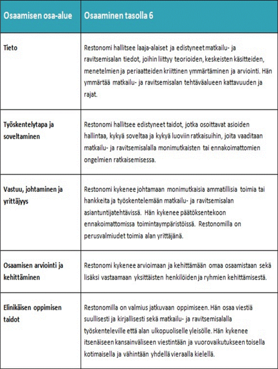 Restonomikoulutus on eurooppalaista ja suomalaista tasoa 6 (kansallinen viitekehys).