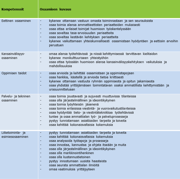 Opiskelija ymmärtää matkailu- ja ravitsemisalan pk-yritysten toiminnan merkityksen palveluelinkeinona. Hän osaa arvioida alan yritystoiminnan toimintaedellytyksiä. Hän tuntee matkailu- ja ravitsemisalan yritystoimintaa säätelevän keskeisen lainsäädännön ja hallitsee perustiedot yrittäjyydestä ja yrityksen perustamisesta. Opiskelija tunnistaa omat vahvuutensa ja kehittymistarpeensa yrittäjyydessä.