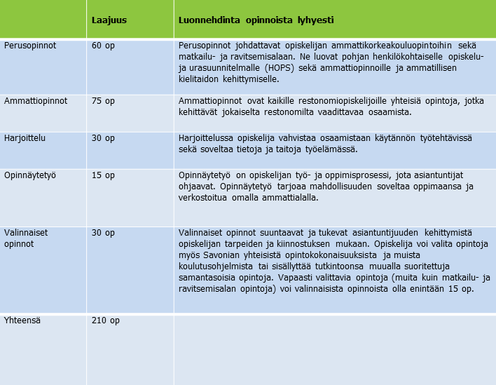 Restonomikoulutus johtaa matkailu- ja ravitsemisalan ammattikorkeakoulututkintoon. Tutkintonimike on restonomi (AMK). Opintojen laajuus on 210 opintopistettä ja kesto 3,5 vuotta.