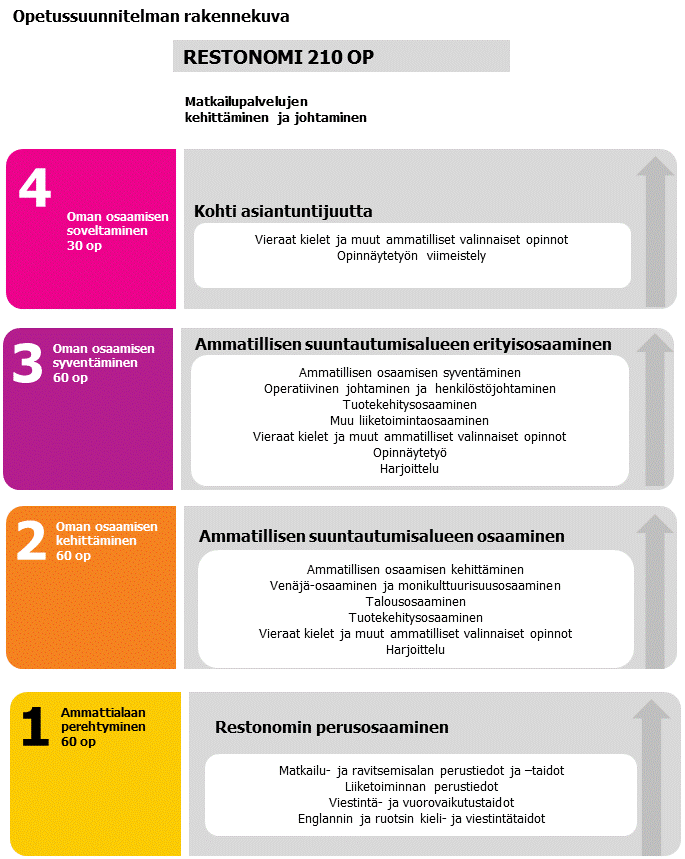 Restonomin osaamisprofiili rakentuu opiskeluvuosien ja opintojaksojen tuottamasta osaamisesta. Kompetenssitaulukosta näkyy eri vuosien opintojaksot ja osaaminen, mitä ne kehittävät.