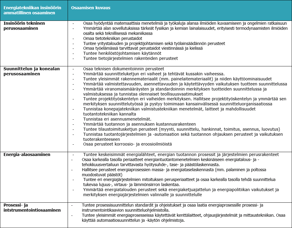 Energiatekniikan insinöörin osaamisprofiili muodostuu seuraavista yleisistä kompetensseista.