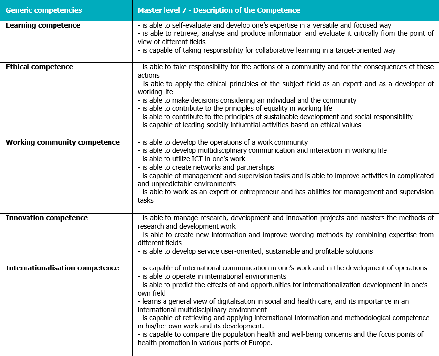 Competence means wide individual professional capability: know how, skills, attitude and potential to work. The content of studies and methods of studying are planned in order to provide students with general and core competences needed in the special but wide field of digitalised Health.