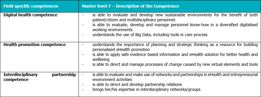 Master of Digital Health expertise degree program’s competence profile is composed of competencies.