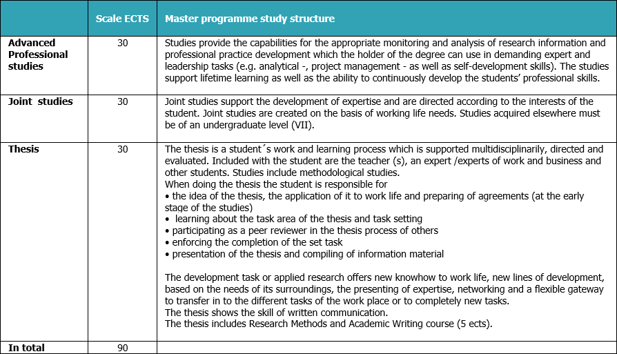Master level studies are 90/60 ECTS credits (one ECTS = student work 27 hours). In accordance with the curriculum of a full-time student one year of study produces 60 ECTS credits which is equivalent to 1600 hours of student work. The study time for Master´s studies varies because of different educational and work backgrounds as well as because of the timetable of the individual studying. A Master´s degree program of 90 ECTS could be executed in 1.5 years; however it usually takes 2 - 3 years. Previously acquired competence and its accreditation can affect the length of the studies. The studies consist of advanced professional studies, joint studies, optional studies and thesis.
