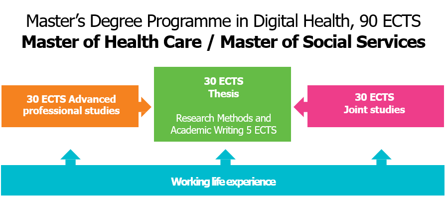 Degree programme in Digital Health leads to a Master's degree in several fields, the qualification title is Master of Health Care or Master of Social Services. The master programme fits for persons who work within the fields of social services, health care, engineering or business and administration. Connector between different fields is the both health and digitalisation.