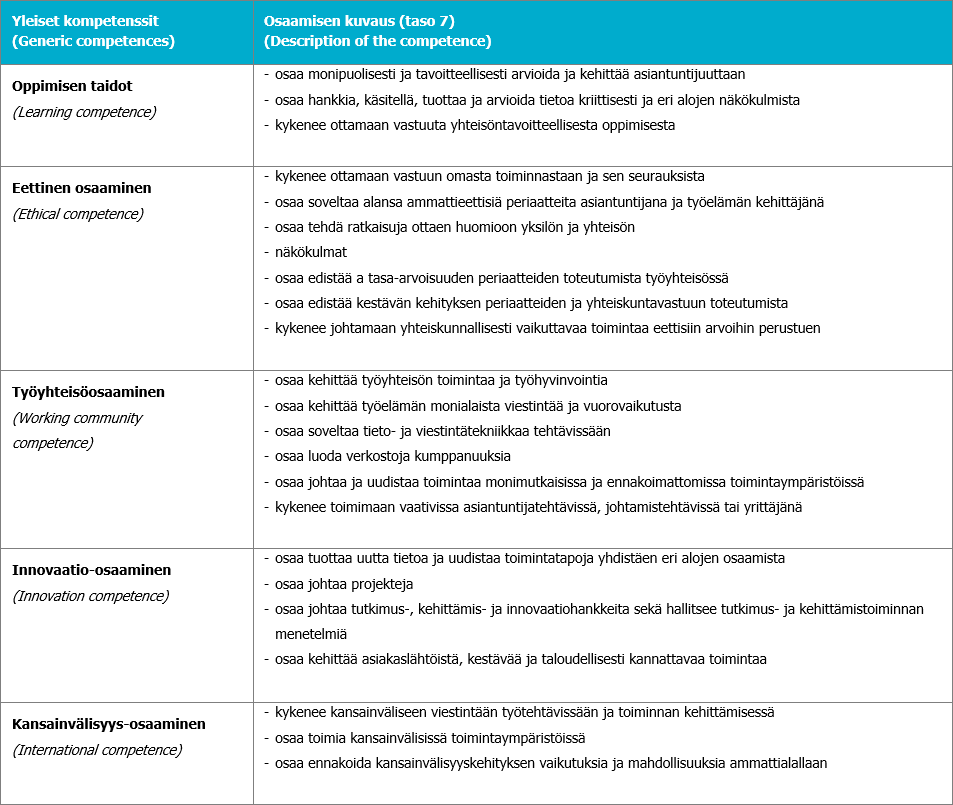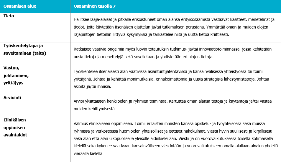 Sosiaali- ja terveysalan kehittämisen ja johtamisen (ylempi AMK) tutkinto on eurooppalaista ja suomalaista tasoa 7 (NQF) (kansallinen viitekehys).