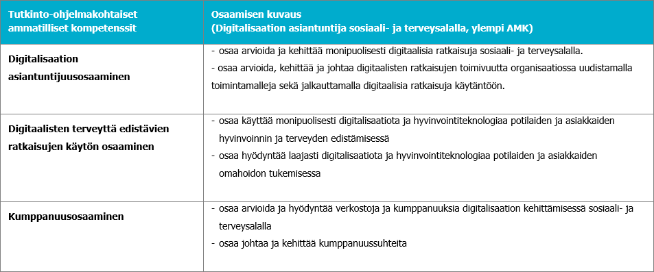 Digitalisaation asiantuntija sosiaali- ja terveysalalla (ylempi AMK) koulutuksessa vahvistetaan digitalisaation asiantuntijaosaamista sosiaali- ja terveysalalla. Asiantuntijuutta luonnehtivat näyttöön perustuva tieto digitalisaation ja hyvinvointiteknologian kehittämiskohteista ja muutostarpeista sosiaali- ja terveysalalla niin kansallisesti kuin kansainvälisestikin. Digitalisaation asiantuntijan työ toteutuu sosiaali- ja terveysalan parissa uudistamalla toimintamalleja digitalisaation keinoin sekä jalkauttamalla digitaalisia ratkaisuja käytäntöön. Opinnoissa vahvistetaan potilas- ja asiakastarpeesta lähtevää digitaalisten ja hyvinvointiteknologian ratkaisujen käyttöönottoon- ja käyttöprosesseihin liittyviä valmiuksia huomioiden tuotekehityksen ja hankintatoimen merkitys sekä tietoturva- ja tietosuojanäkökulmat. Digitalisaation asiantuntijan osaamisvaatimukset ovat kansainvälisesti yhdenmukaiset. Opinnoissa vahvistetaan myös opiskelijoiden kansainvälisiä valmiuksia.