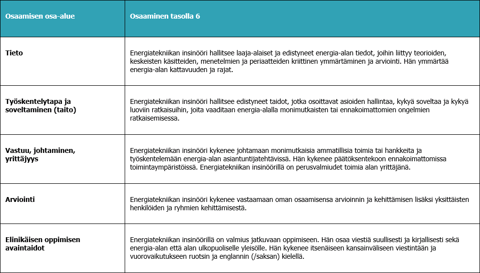 Energiatekniikan insinöörin koulutus on eurooppalaista ja suomalaista tasoa 6 (Kansallinen viitekehys).