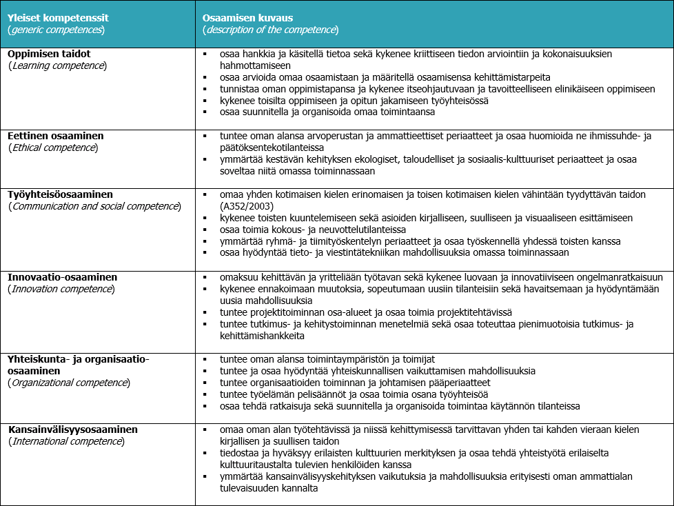 Energiatekniikan insinöörin osaamisprofiili muodostuu seuraavista yleisistä kompetensseista.