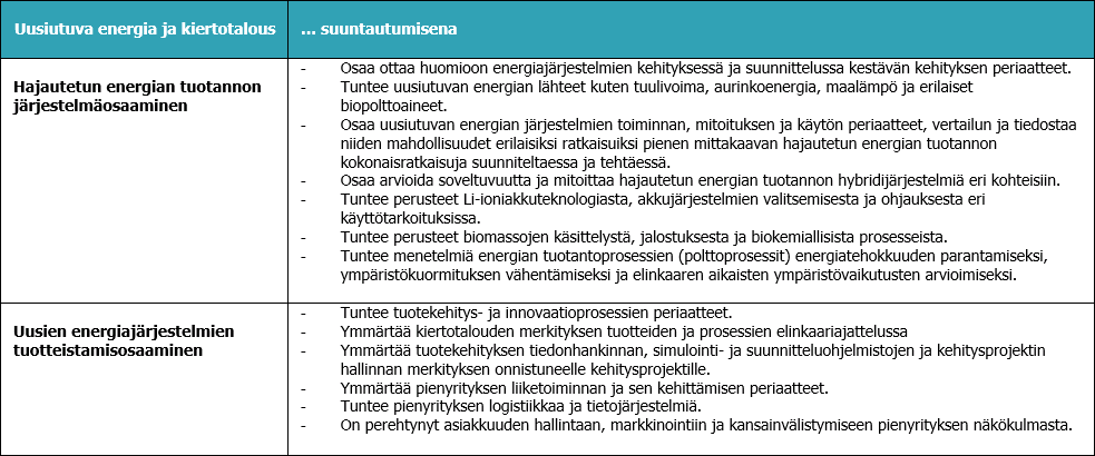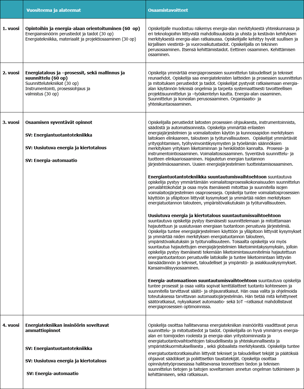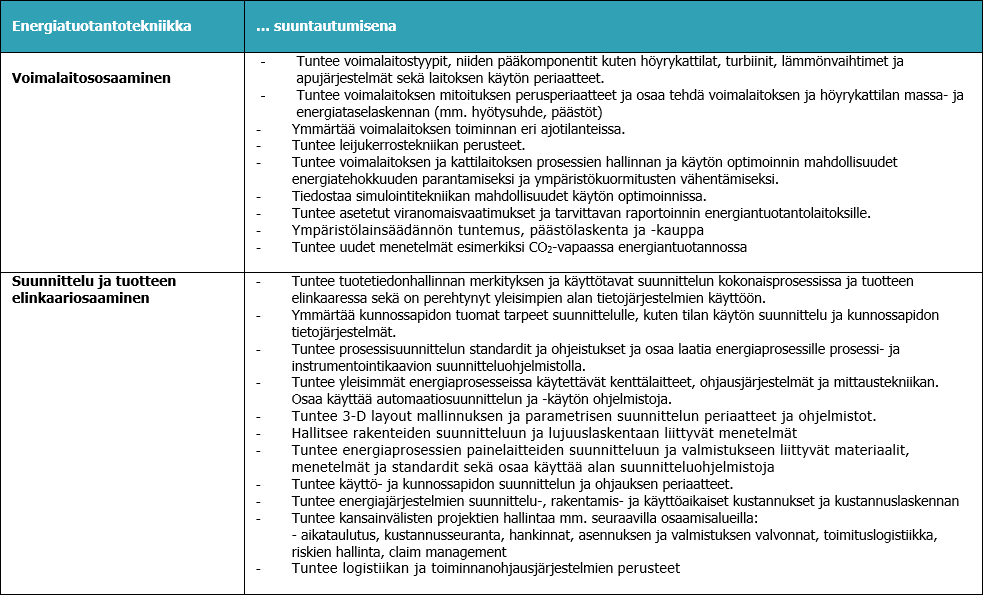 Osaamistavoitteet energiatekniikan tutkinto-ohjelmassa määräytyvät energiainsinöörien työelämän osaamistarpeiden mukaan. Perus- ja tutkinto-ohjelmakohtaiset ammattiopinnot ovat kaikille yhteisiä ja antavat laaja-alaiset perusvalmiudet tekniseen perusosaamiseen, suunnittelu- ja konealaosaamiseen, energia-alaosaamiseen sekä prosessi- ja instrumentointiosaamiseen. Suuntautumisvaihtoehtojen kautta syvennetään osaamista joko prosessisuunnittelupainotteisiin energiateollisuuden tehtäviin tai kehityspainotteisiin uusiutuvan energian järjestelmien suunnittelu- ja tuotekehitys- ja tuotteistamistehtäviin.