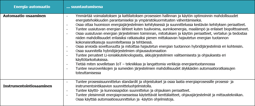 Energia-automaation suuntautumisessa perehdytään automaatiotekniikan älykkäillä järjestelmillä tapahtuviin energiantuotantoprosessien hallintaan ja suunnitteluun. Opiskelijat perehtyvät mittaus-, ohjaus- ja säätötekniikan sekä instrumentointi opintojen kautta tuuli-, aurinko- ja voimalaitosprosessien tulevaisuuden käyttökohteiden automaatiojärjestelmien suunnitteluun. He tietävät miten hyödyntää IoT - sovelluksia ja tietoverkkoja energiantuotannossa ja tuntevat sumeiden järjestelmien ja neuroverkkojen käytön merkityksen (Big Data) suurten tietomäärien tiedon louhinnassa ja hyödyntämisessä. Opetuksessa keskitytään myös ohjelmointiin ja testaamiseen sekä järjestelmien käyttöön ja kunnossapitoon 3D - virtuaalitodellisuuden avulla.