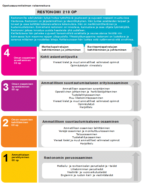 Opiskelun tavoitteena on opiskelijan ammatillisen osaamisen kasvu kohti matkailu- ja ravitsemisalan asiantuntijuutta. Opiskelu ammattikorkeakoulussa on aktiivista tiedonrakentamista, jossa opiskelija ottaa vastuun omasta opiskelustaan, työstään ja ympäristöstään. Tätä opiskelijoiden itseohjautuvuutta korostetaan opetuksessa ja ohjauksessa opintojen alusta lähtien.