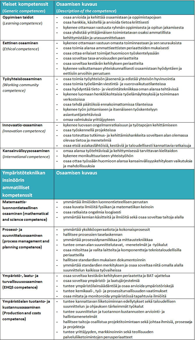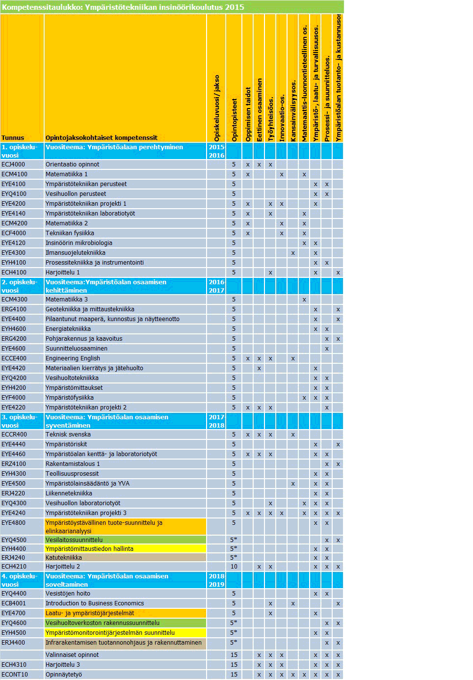 Ympäristötekniikan insinöörin osaamisprofiili rakentuu opiskeluvuosien ja opintojaksojen tuottamasta osaamisesta. Kompetenssitaulukossa on esitetty vuosikursseittain suoritettavat opinnot ja niiden myötä syntyvä osaaminen.