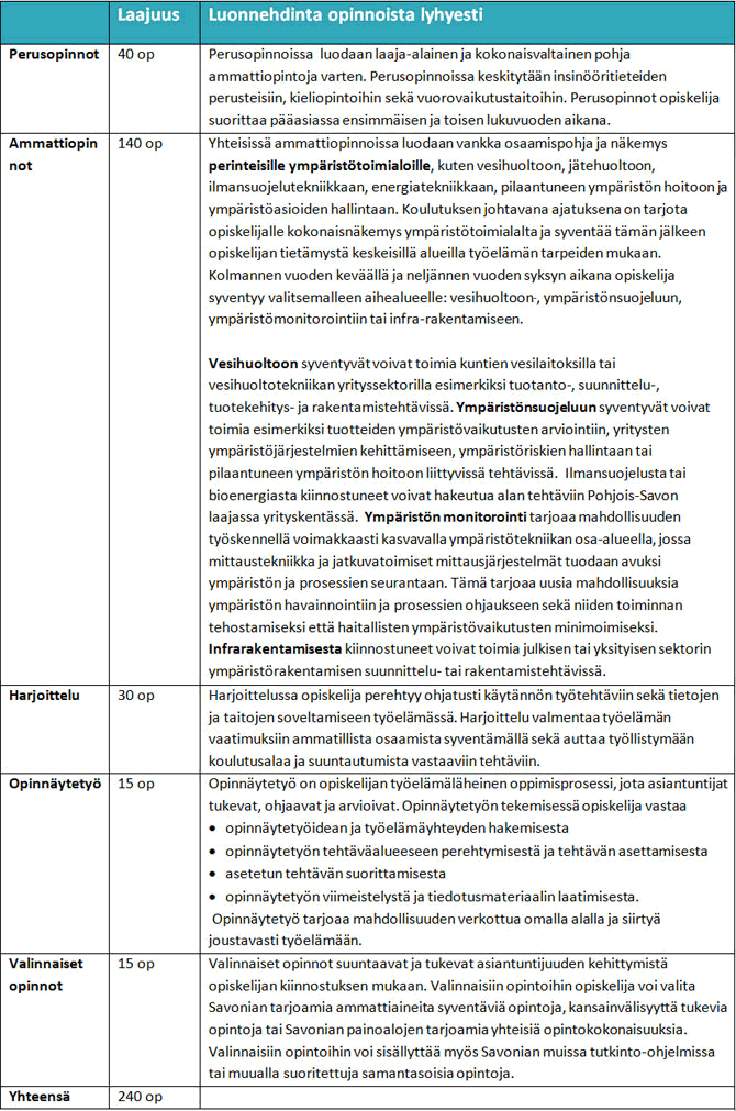 Ympäristötekniikan tutkinto-ohjelman tavoitteena on kouluttaa osaavia insinöörejä kasvavan ja kehittyvän ympäristötoimialan tarpeisiin. Ympäristöala tarjoaa runsaasti erilaisia mahdollisuuksia ja työpaikkoja opiskelijoille sekä alalla toimiville insinööreille. Työtehtävät alalla ovat vaihtelevia ja tarjoavat tekijöilleen mielenkiintoisia haasteita. Ympäristötekniikan tutkinto-ohjelmasta valmistuva insinööri voi työskennellä