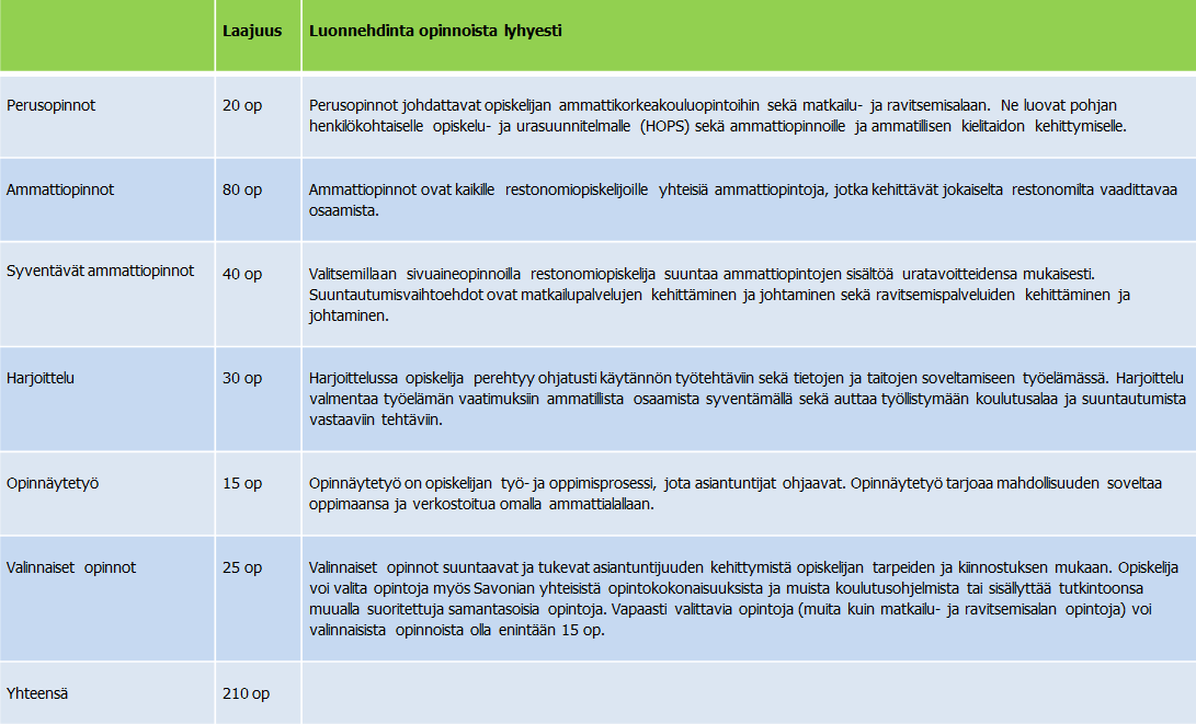Restonomiopintojen laajuus on 210 opintopistettä. Opetussuunnitelman mukaan yksi opiskeluvuosi vastaa 60 opintopistettä, mikä tarkoittaa 1600 tuntia opiskelijan työtä. Opiskelijan työ koostuu mm. lähiopetuksesta, etä- ja itsenäisestä opiskelusta, verkko-opiskelusta ja harjoittelusta. Opiskelu sisältää työelämälähtöistä tutkimus- ja kehittämistoimintaa.