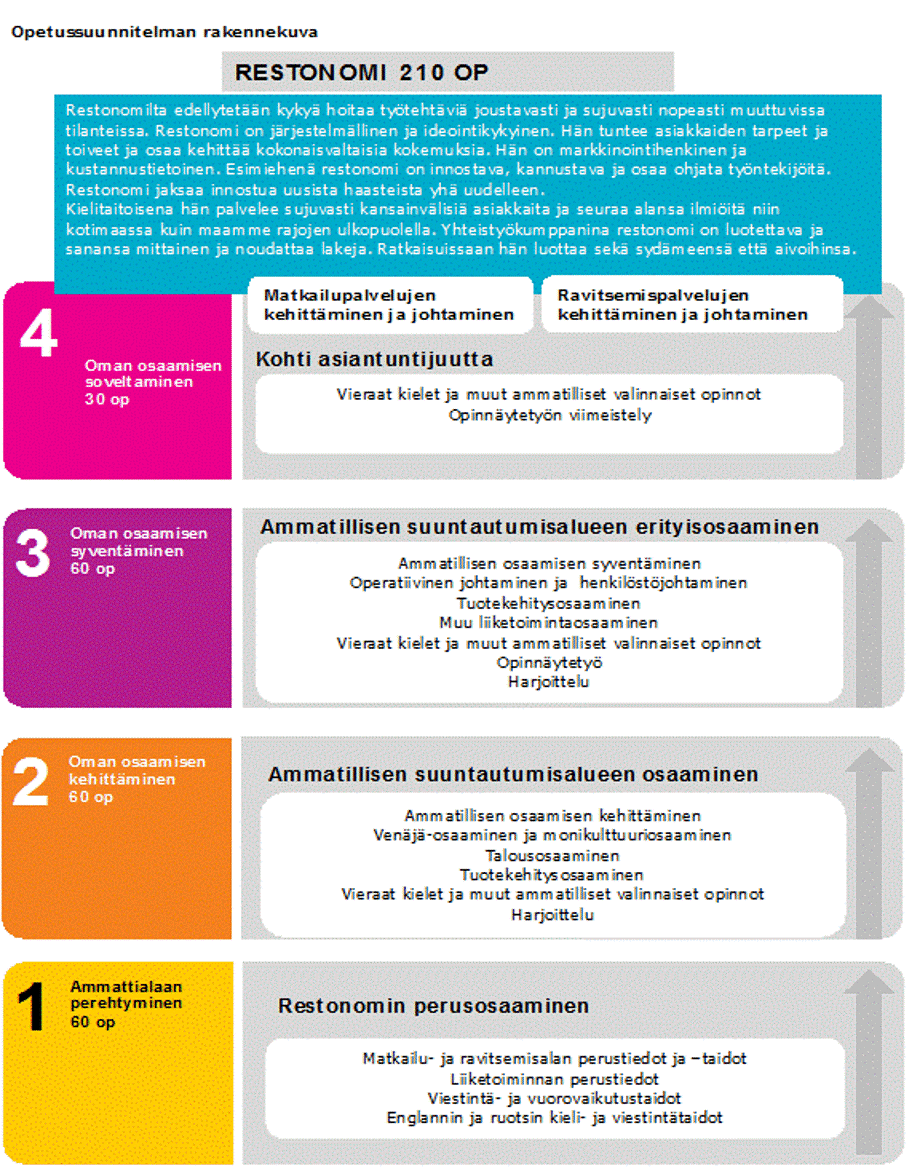 Opiskelun tavoitteena on opiskelijan ammatillisen osaamisen kasvu kohti matkailu- ja ravitsemisalan asiantuntijuutta. Opiskelu ammattikorkeakoulussa on aktiivista tiedonrakentamista, jossa opiskelija ottaa vastuun omasta opiskelustaan, työstään ja ympäristöstään. Tätä opiskelijoiden itseohjautuvuutta korostetaan opetuksessa ja ohjauksessa opintojen alusta lähtien.