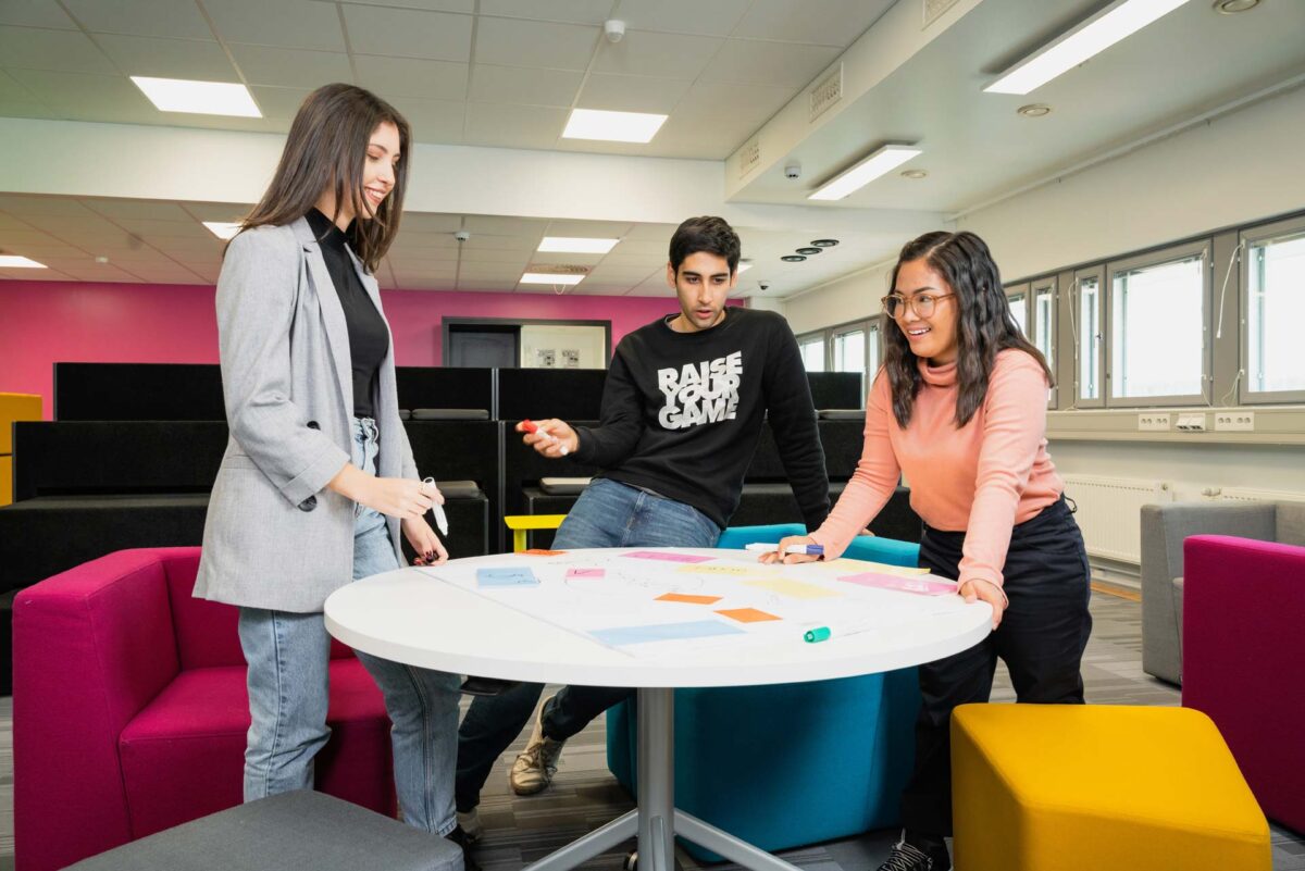 Opiskelijat pitävät kahvitaukoa kampuksen ravintolassa.