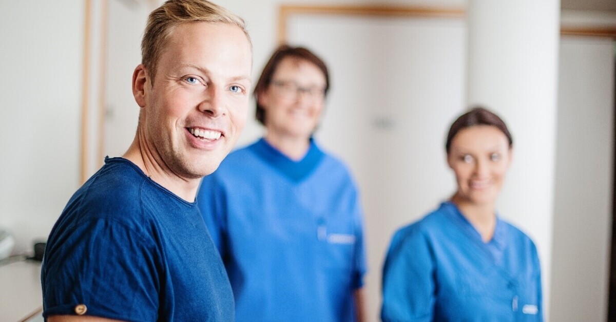 Viisi värikkäisiin leikkausasuihin pukeutunutta terveydenhuollon työntekijää seisoo selkä kameraan päin, kädet toistensa olkapäiden ympärillä, osoittaen yhtenäisyyttä ja tukea kirkkaalla sairaalan tai hoitolaitoksen käytävällä. PRO