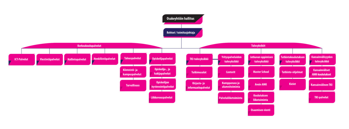 Savoniassa johtamisen tehtävänä on ohjata toimintaa strategian suuntaisesti ja tavoitteellisesti. Savoniassa on viisi tulosyksikköä sekä niitä tukevat korkeakoulupalvelut. Opetuksen ja TKI-toimintojen sekä palvelutoimintojen käytännön toiminta tapahtuu toiminnallisissa tiimeissä. Savonian organisaatiokaavion voit ladata klikkaamalla alla olevaa linkkiä.