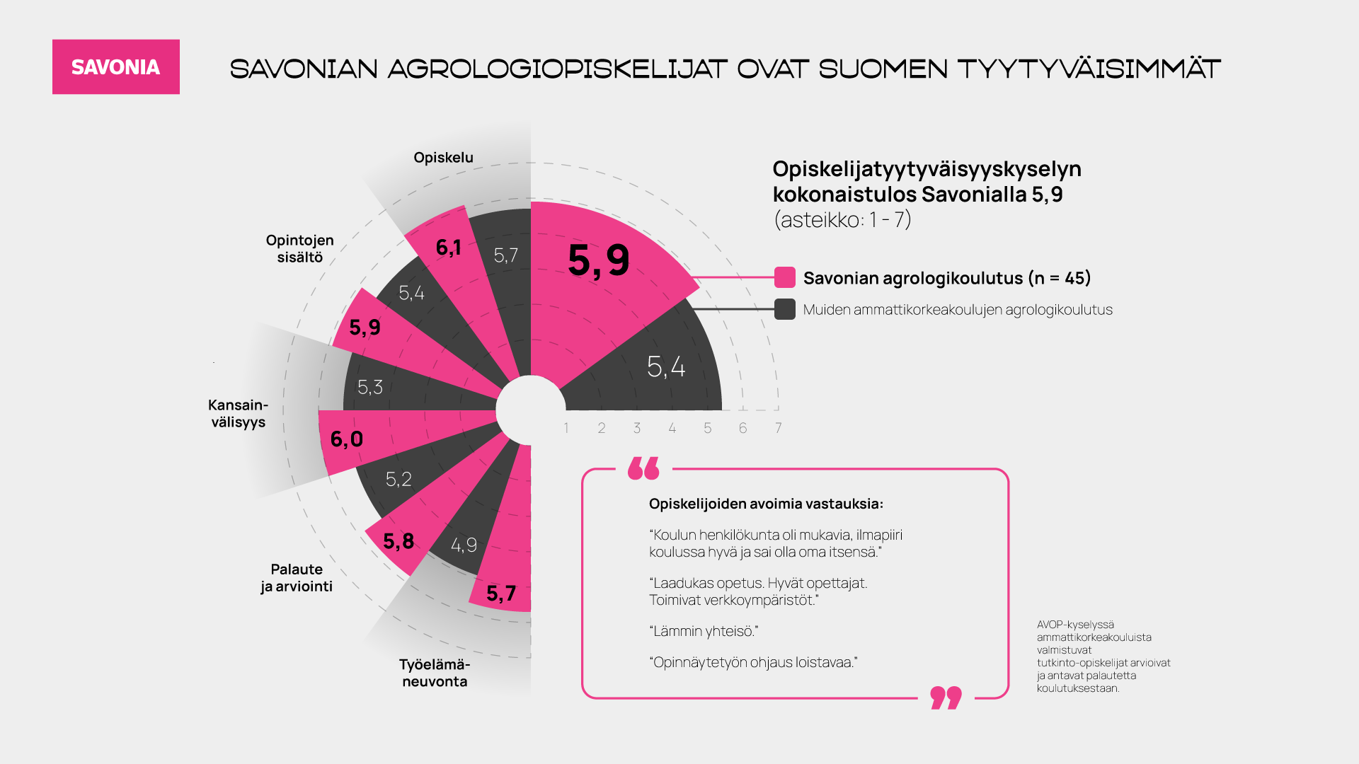 Tuoreessa valtakunnallisessa opiskelijatyytyväisyyskyselyssä (AVOP) Savonian agrologiopiskelijoiden vastausten keskiarvo oli 5,9. Muiden ammattikorkeakoulujen agrologikoulutusten keskiarvo oli 5,4. Arviointi tapahtui asteikolla 1–7.