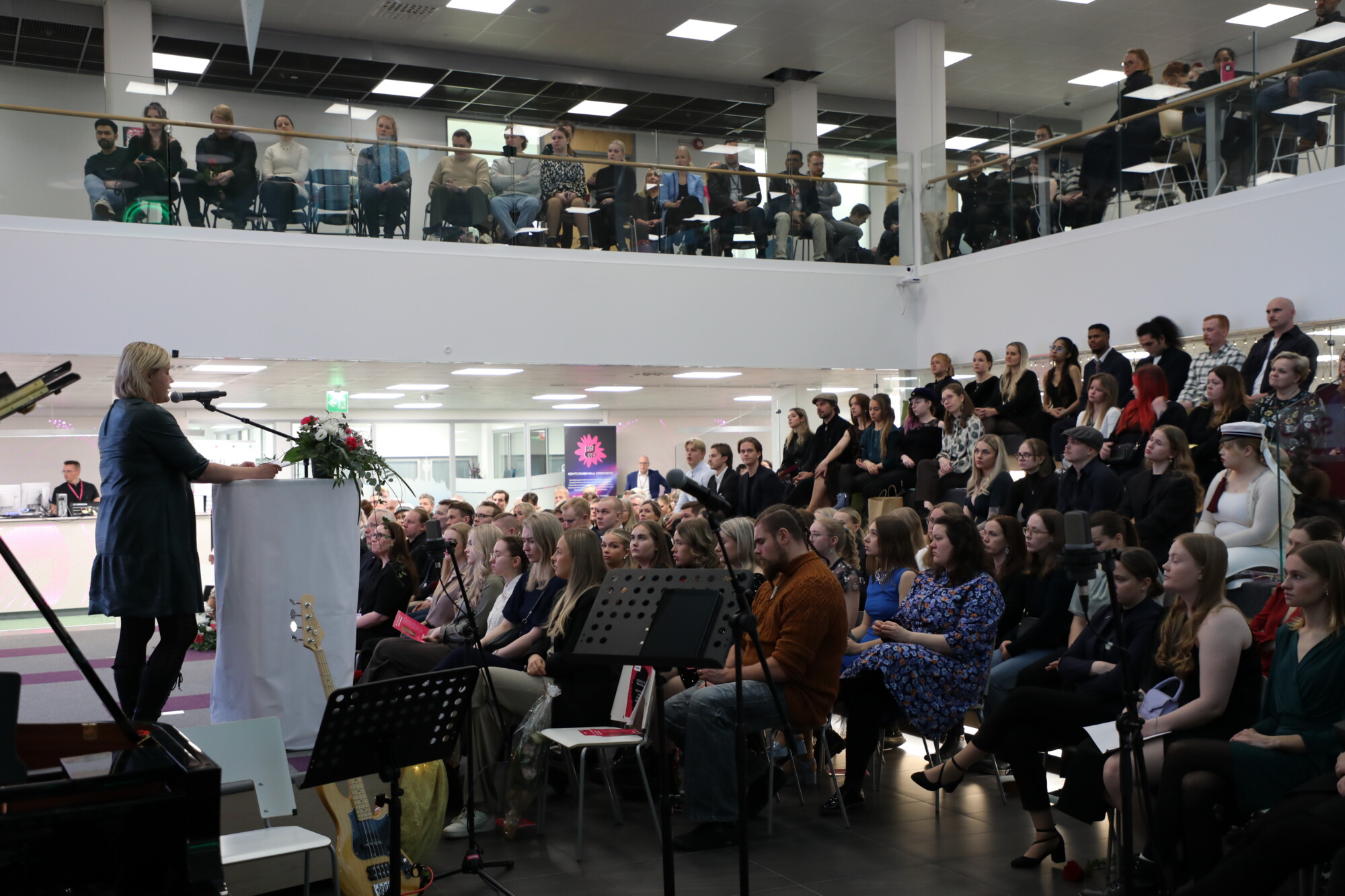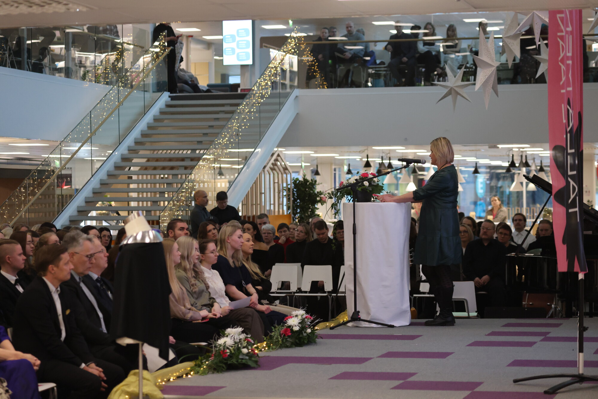 Valmistujaisjuhlassa kuultiin useita puheenvuoroja, jotka nostivat esiin koulutuksen ja jatkuvan oppimisen merkityksen yhteiskunnassa.