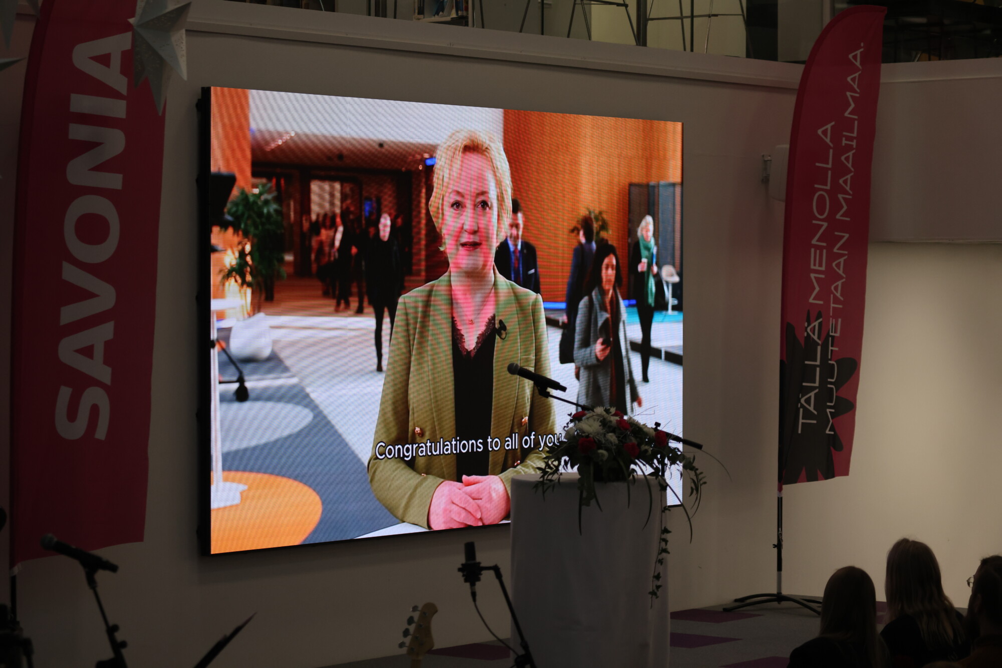 Tilaisuudessa kuultiin myös terveisiä Savonian alumneilta. Vuoden alumniksi valittu europarlamentaarikko Elsi Katainen on valmistunut Savonialta agrologiksi. Videotervehdyksessään hän muistutti, että Savonian monipuolinen valmistuvien joukko on osoitus korkeakoulutuksemme erinomaisuudesta. Savonian elintärkeiden osaajien kouluttaminen sekä tutkimus-, kehittämis- ja innovaatiotyö ovat kallisarvoisia niin yhteiskunnallisesti kuin jokaiselle valmistuneelle henkilökohtaisesti.