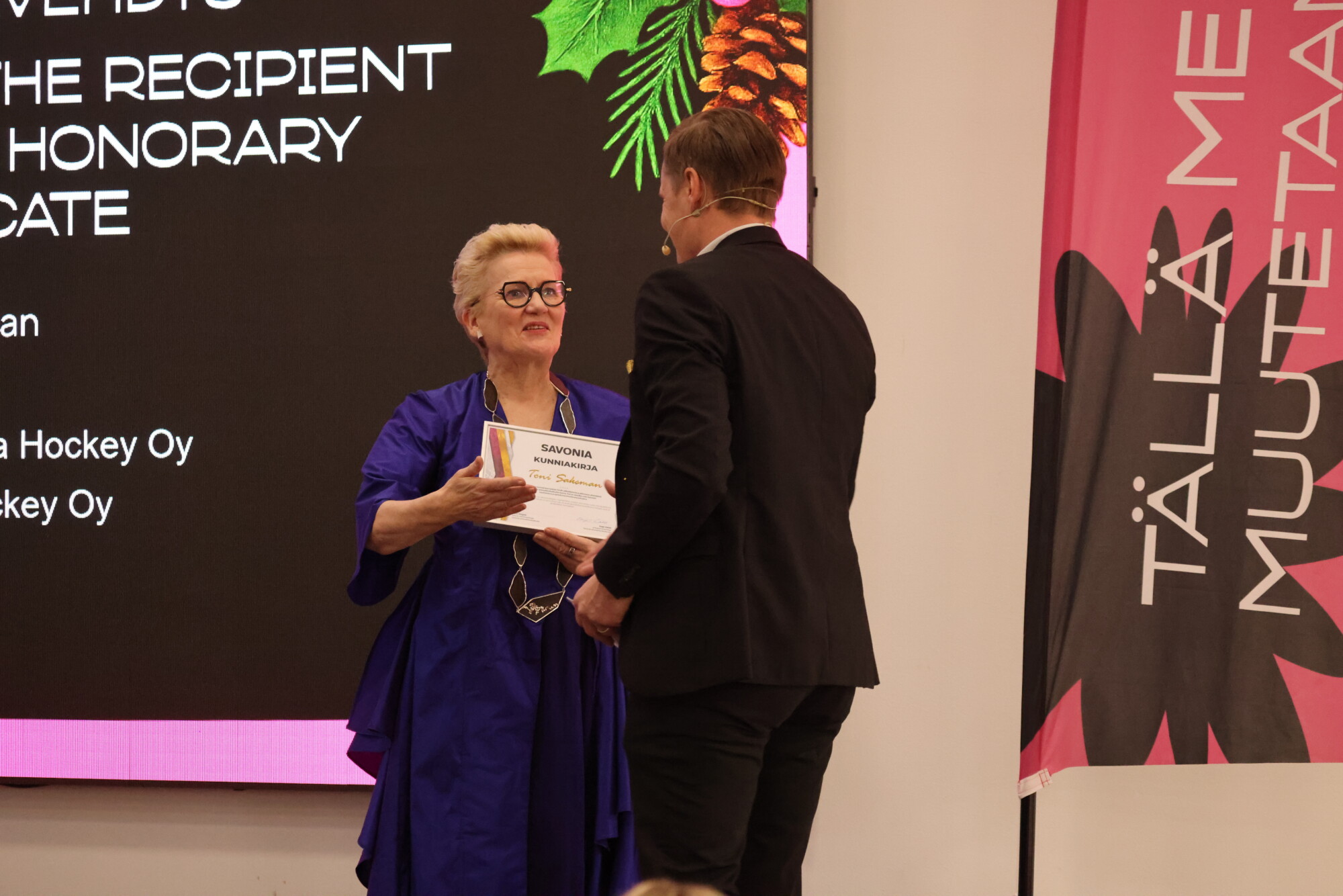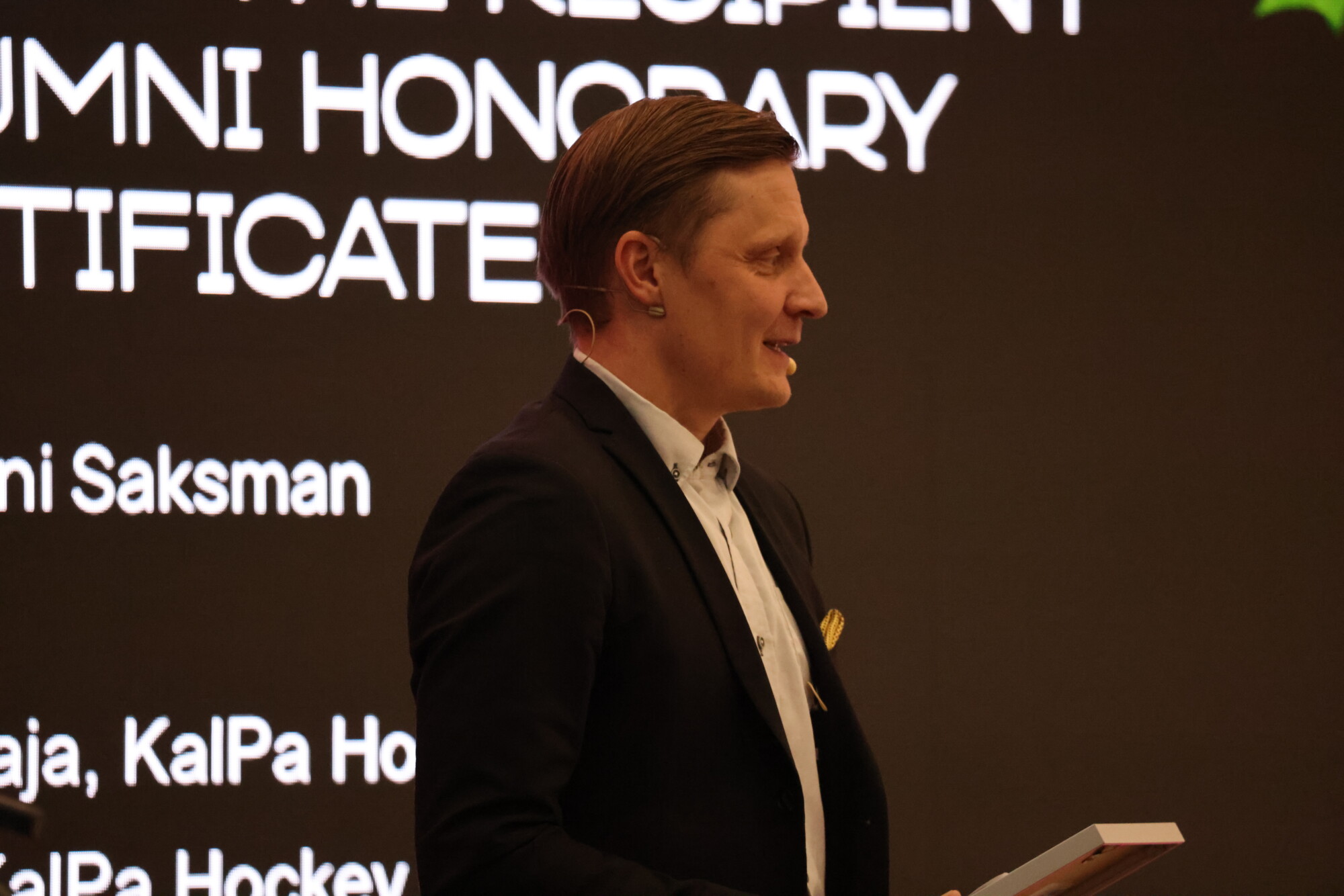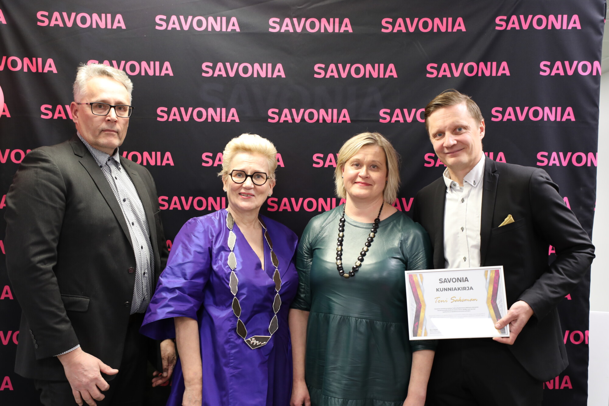 Kalpan toimitusjohtaja Toni Saksman puolestaan palkittiin tilaisuudessa alumnikunniakirjalla. Kunniakirja myönnettiin menestyksekkäästä yrityksen rakentamisesta niin urheilun ja talouden saralla sekä pitkäaikaisesta yhteistyöstä Savonian kanssa.