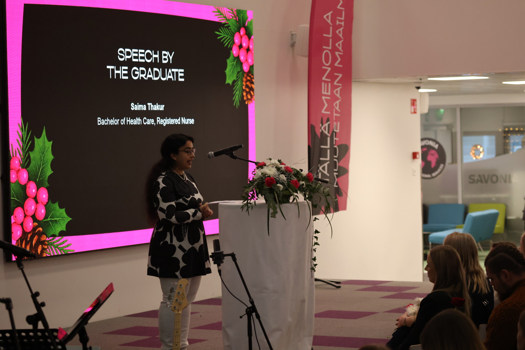 – Tämä hetki on monelle varmasti helpottava, mutta haikea, koska yksi elämänvaihe on jäämässä taakse. Opiskelijayhdistyksen vapaaehtoiset tekevät tärkeää työtä opiskelijaviihtyvyyden ja -yhteisön rakentamiseksi – toiminta tekee opiskelusta muutakin kuin luentoja ja raportteja. Jokainen osallistuminen rakentaa yhteisöä, jossa viihdytään ja jossa opiskelijan ääni kuuluu. Teissä on osaamista, rohkeutta ja näkemystä; sellaisia ominaisuuksia, mitä yhteiskunta kaipaa. Muistakaa, että Savonia, SAVOTTA ja opiskelijayhdistykset seuraavat mukananne myös jatkossa.