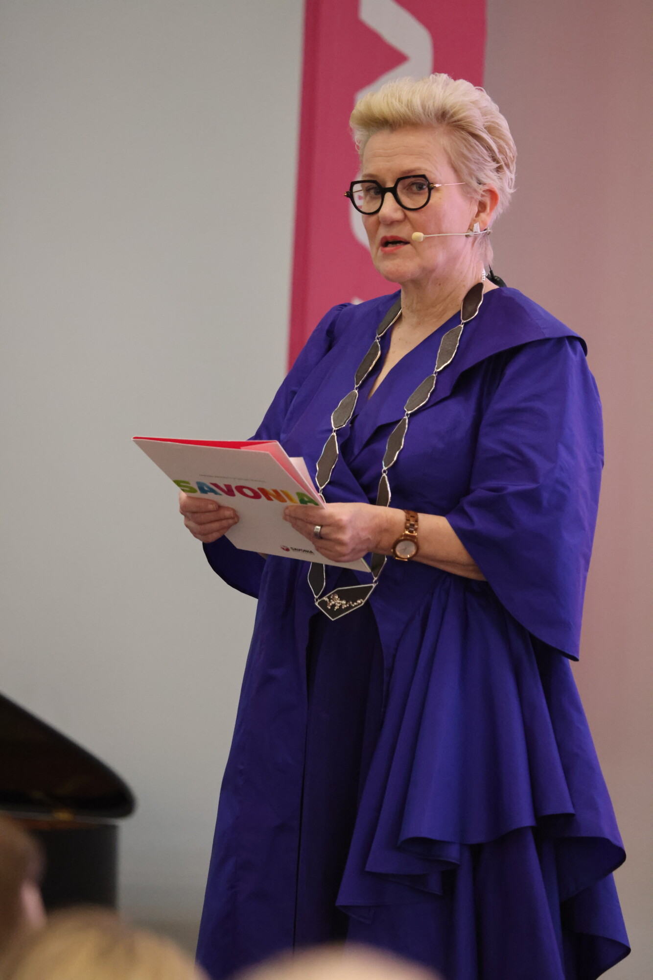 – Oli upea kunnia edustaa Linnan juhlissa opiskelijoidemme suunnittelemassa ja valmistamassa asussa ja korussa. Sain myös seurata valmistamisprosessin aikana läheltä opettajiemme ohjaamistyötä. Halusimme, että rehtorin käädyt edustavat Savonian ainutlaatuista osaamista. Siksi käätyjen materiaali ei ole perinteinen, vaan koivua. Ja kyllä siellä näkyy Savonian pinkkiäkin mukana. Nämä ovat ajankohtaisia esimerkkejä Savonian osaamisesta, mutta vaikuttavuus näkyy laajasti myös muualla eri aloilla, Vidgrén sanoo.