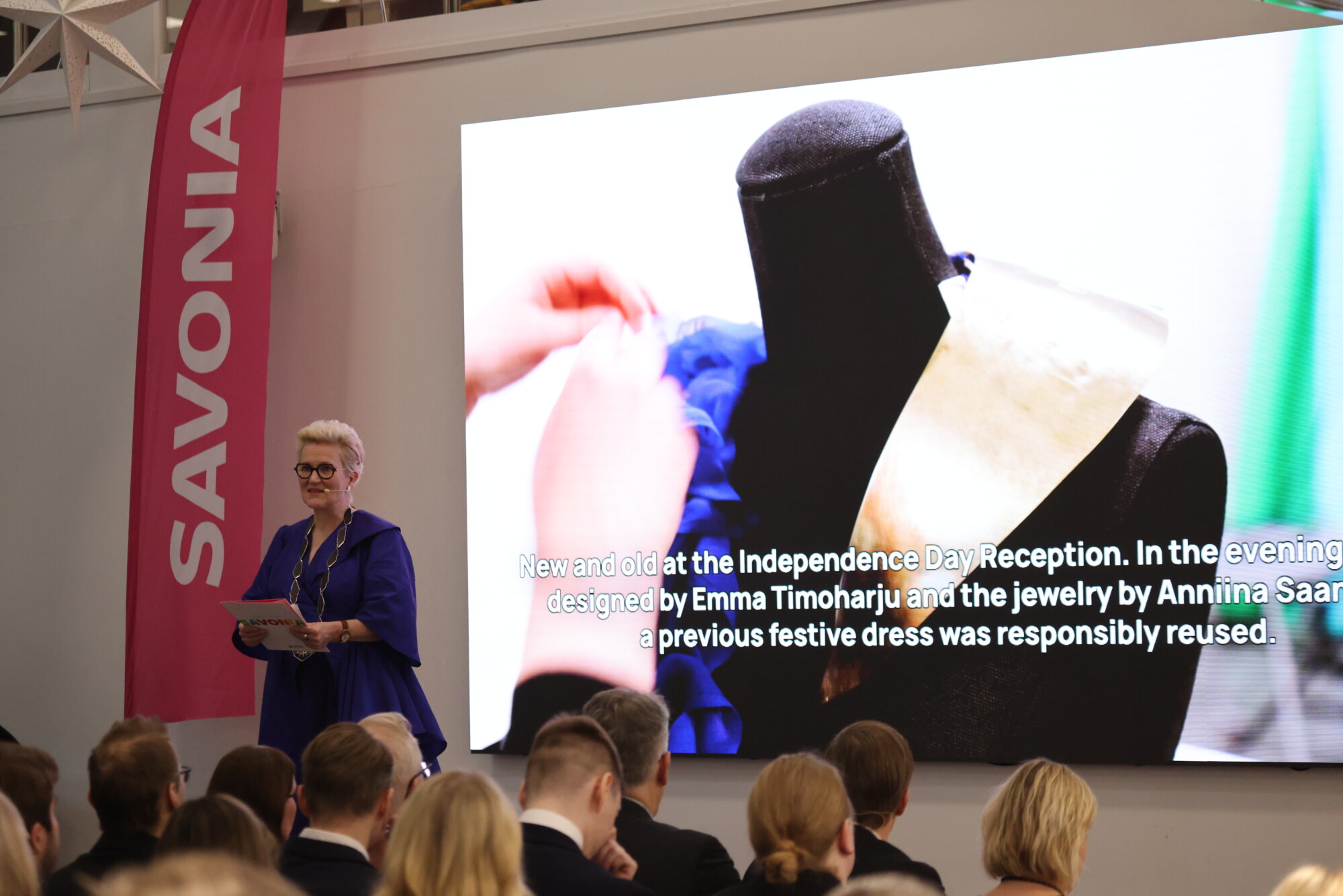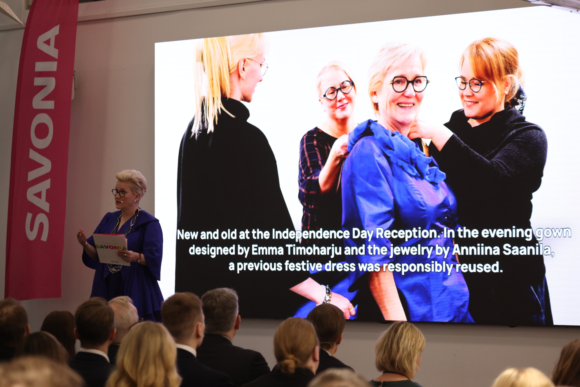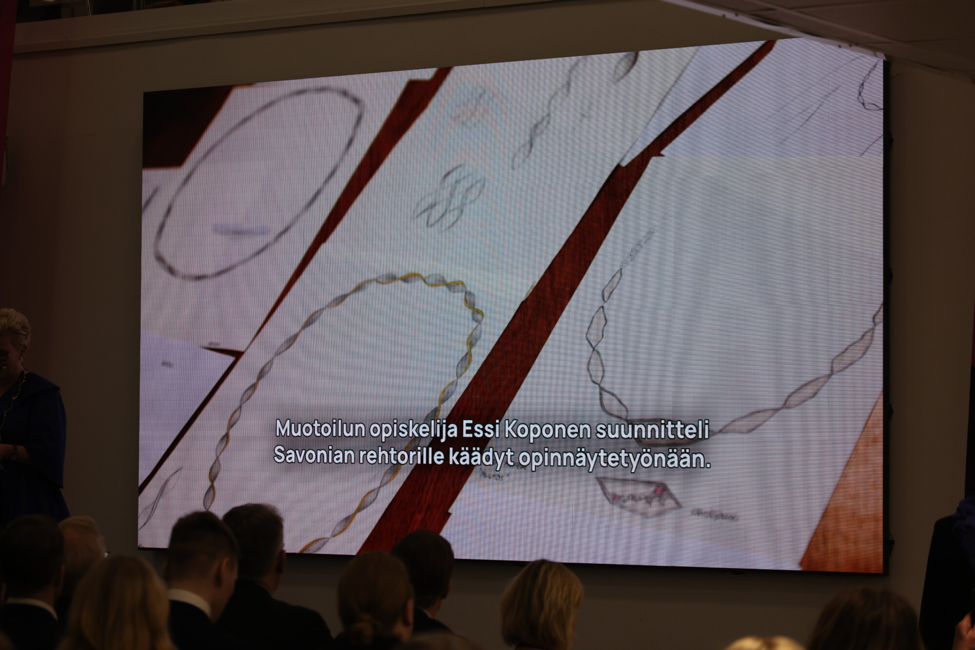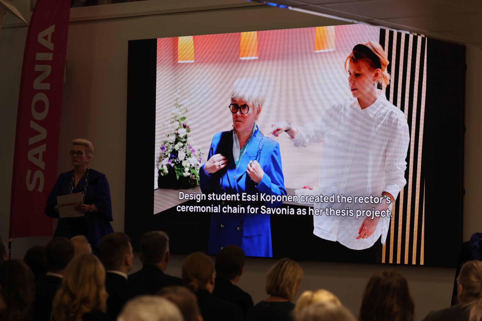 Valmistujaisissa nähtiin tästä konkreettinen esimerkki, sillä rehtori Mervi Vidgrénillä oli yllään muotoilun opiskelija Emma Timoharjun presidentin itsenäisyyspäivän iltavastaanotolle suunnittelema ja valmistama asu sekä Savonian rehtorille juuri ennen juhlaa valmistuneet käädyt (Essi Koposen opinnäytetyö). Esillä oli myös Linnan juhlissa nähty koru (Anniina Saanilan opinnäytetyö).