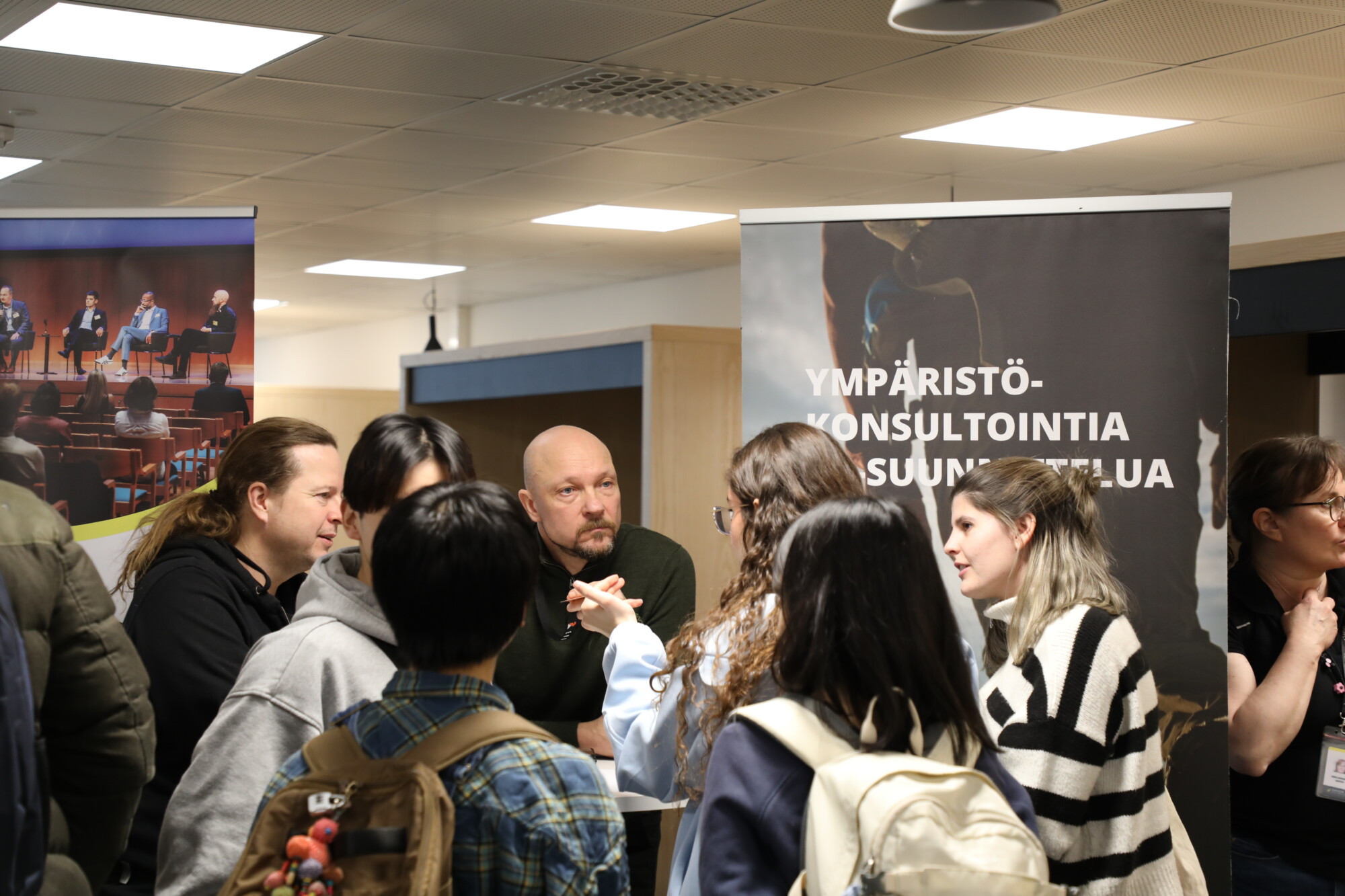 Tilannetta tutkailemaan olivat saapuneet myös Anna, Vilho, Elli ja Viivi. Nelikko opiskelee Itä-Suomen yliopistossa 3. ja 4. vuotta ympäristötieteitä. He kertoivat, että kaikki kiinnostaa: opinnäytetyön aiheet, harjoittelu- ja kesätyömahdollisuudet. Tilaisuuteen he saapuivat avoimin mielin.