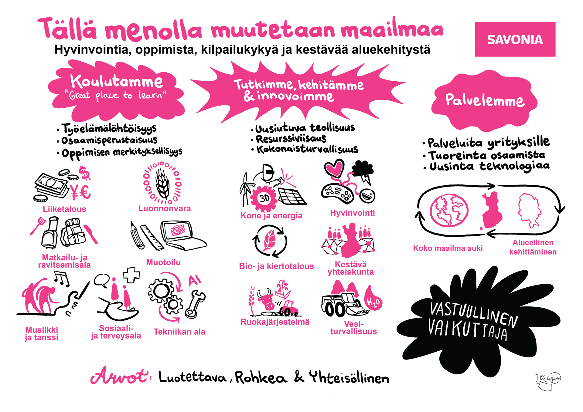 Savonia on vahva aluekehitystyötä tukeva työelämäläheinen ammattikorkeakoulu, joka tekee vastuullisesti vaikuttavaa työtä. Savonian näyttöihin perustuva tekeminen on alueellisesti, kansallisesti ja valituilla osa-alueilla myös kansainvälisesti vahvaa.